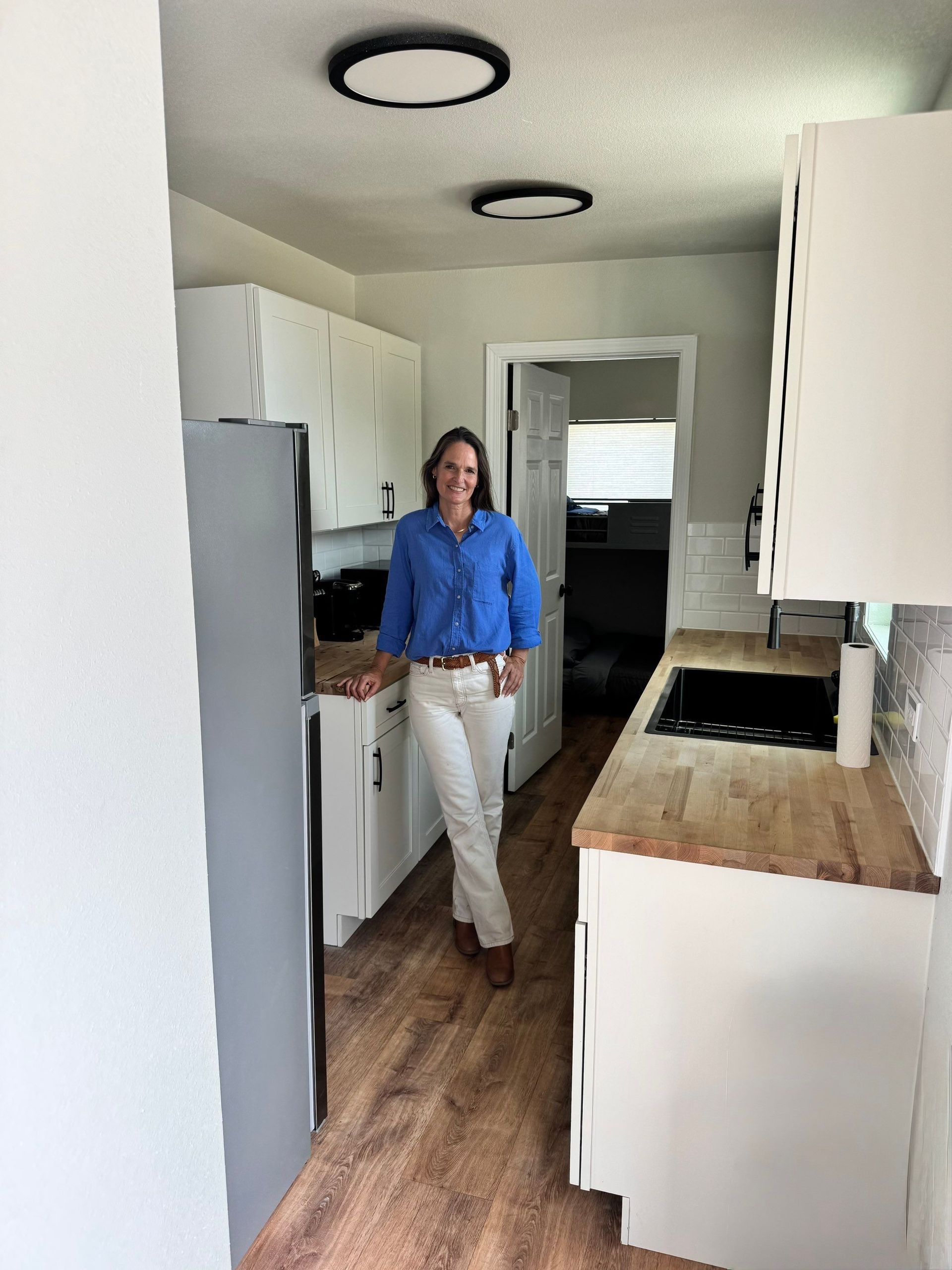 The couple wanted to keep costs down by doing a lot of the work themselves, so we started with a 40' used shipping container, cut it to 15 feet, end-capped it, and installed a sliding glass door and two windows to provide the space with lots of natural interior light. We welded on the interior studs and they added insulation, hung the drywall and did all of the interior finishing work themselves.